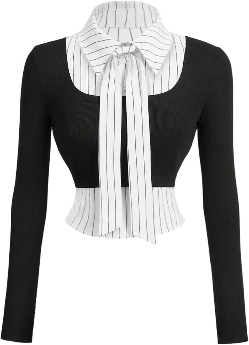 MakeMeChic Women's Striped Button Front Blouse Long Sleeve Work Crop Tops with Tie