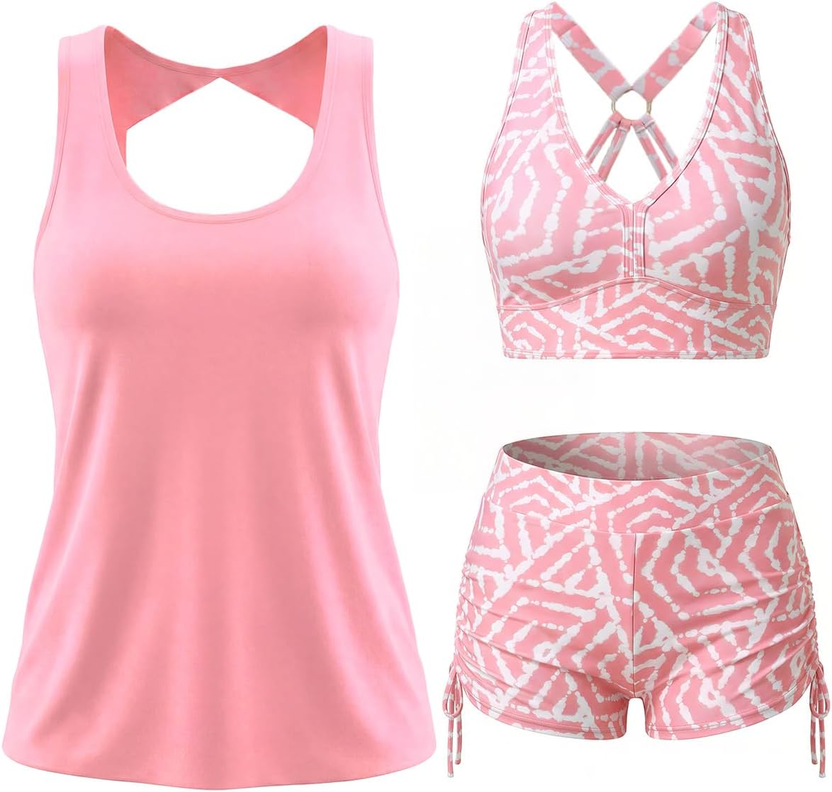 Modlily Classic 3 Piece Tankini Swimsuits for Women, Solid Tank Top & Plants Print Sports Bra with Drawstring Board Shorts