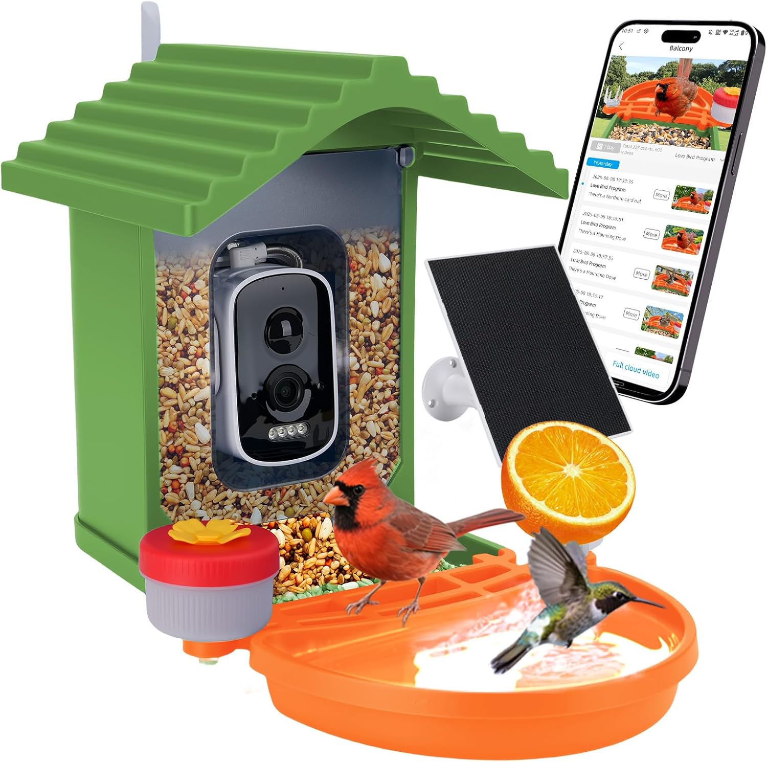 Smart AI Bird Feeder with Camera,2.5K HD Live View,Solar Powered,Instant Birds Species Recognition,Real Time Alerts,Wireless Birdhouse with Night Vision,Ideal Gift,Green