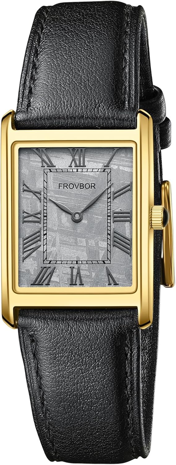 Gold Watches for Women with Leather Strap Sapphire Crystal Glass Rectangular Case Meteorite Surface Roman Dial