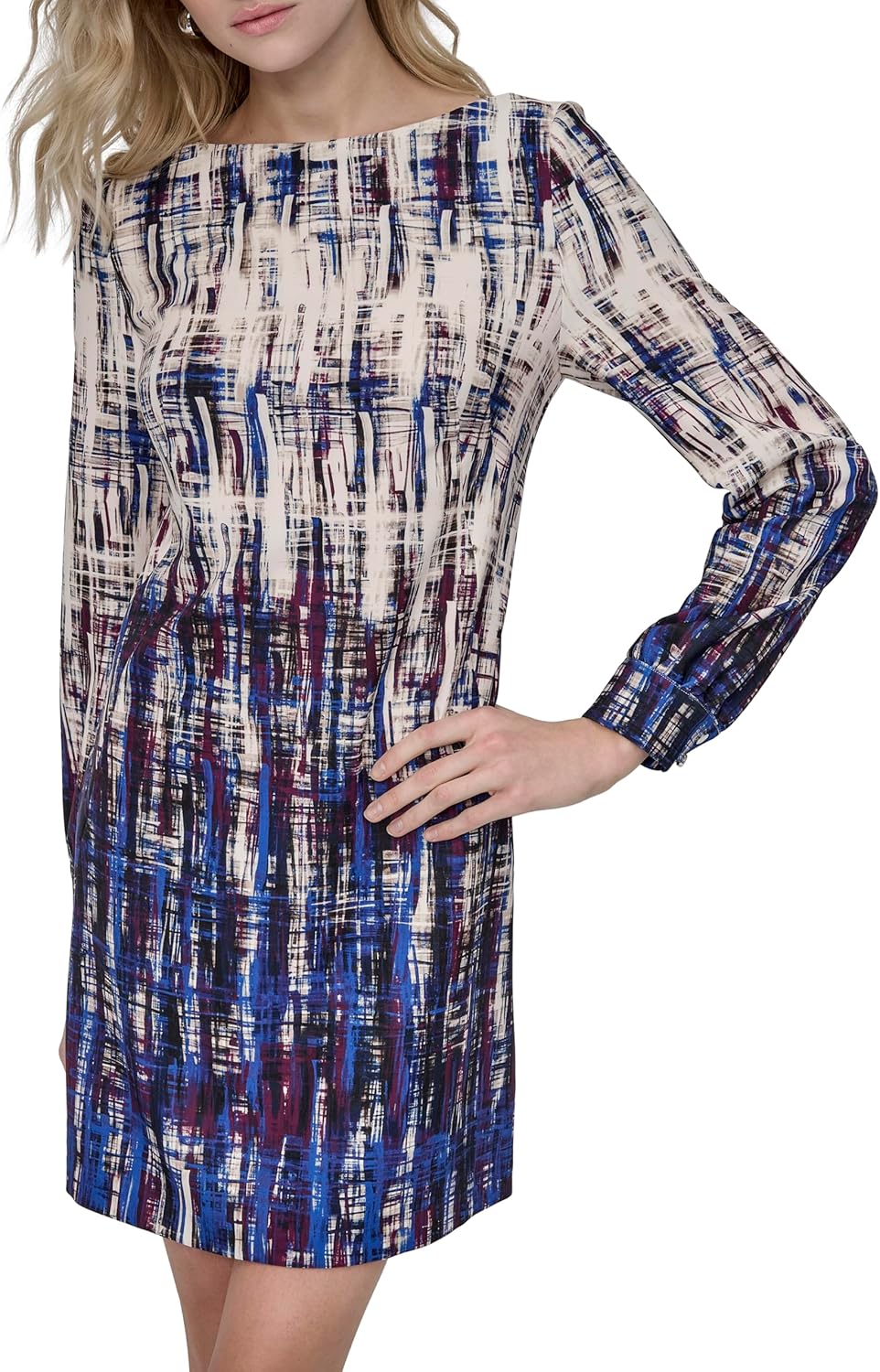DKNY Womens Long Sleeve Jewel Neck Unlined Mini Sheath Dress