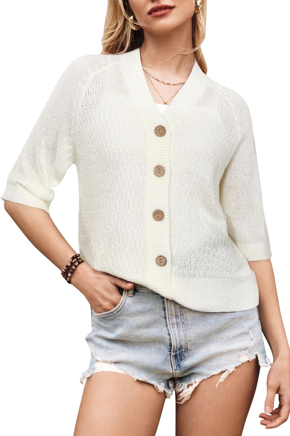 Arach&Cloz Womens Lightweight Cardigan Short Sleeve Shrugs Button Crochet Knit Fashion Sweaters Tops Cozy Clouds Beige