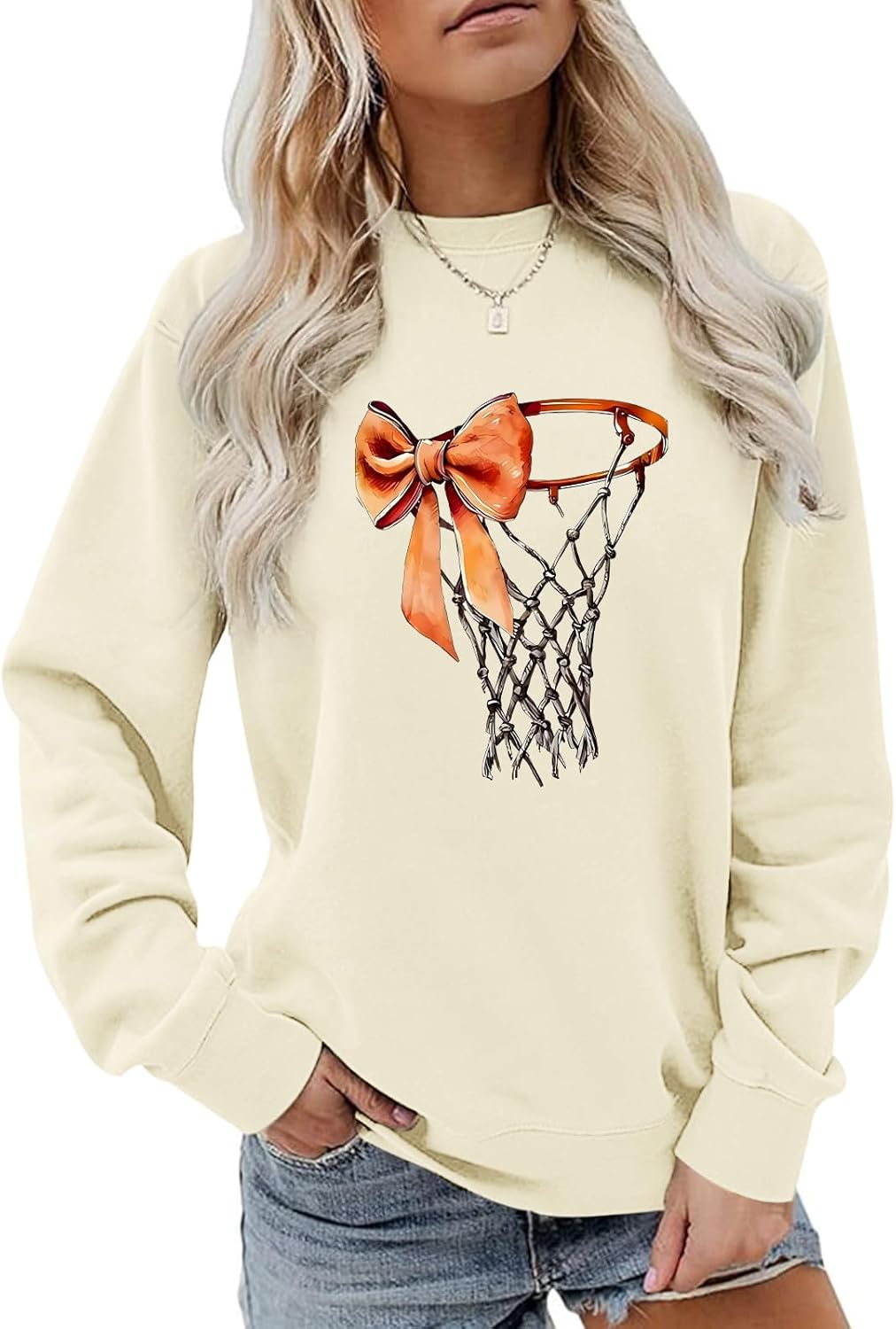 Basketball Crewneck Sweatshirt for Women Game Day Sweatshirts Bow Graphic Long Sleeve Pullover Gameday Themed Gifts
