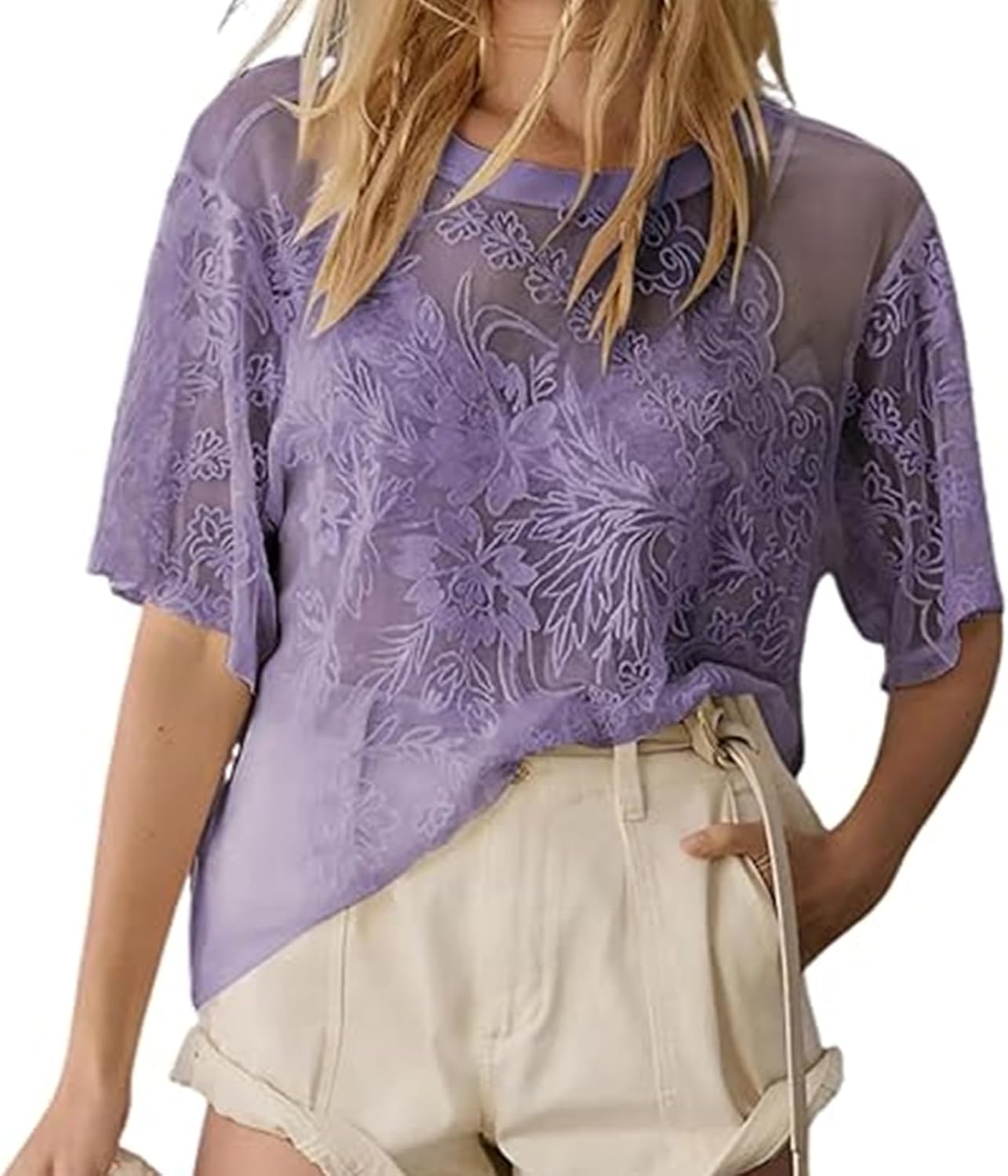 Women's Sexy Lace Mesh Tops Short Sleeve Round Neck Floral Embroidered Sheer Blouse See Through Layering Shirt Tops