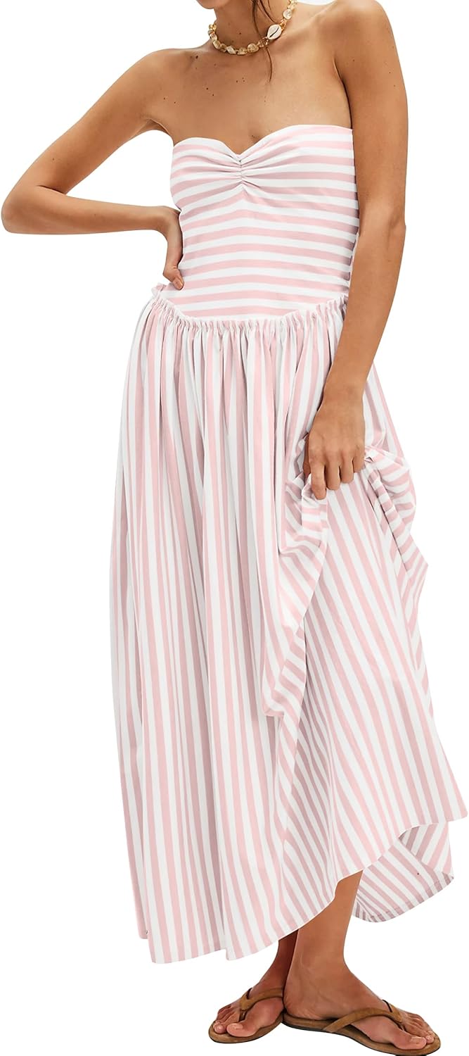 Striped Tube Top Beach Dresses for Women Strapless Pleated Flowy Maxi Dress Summer Party Midi Dresses