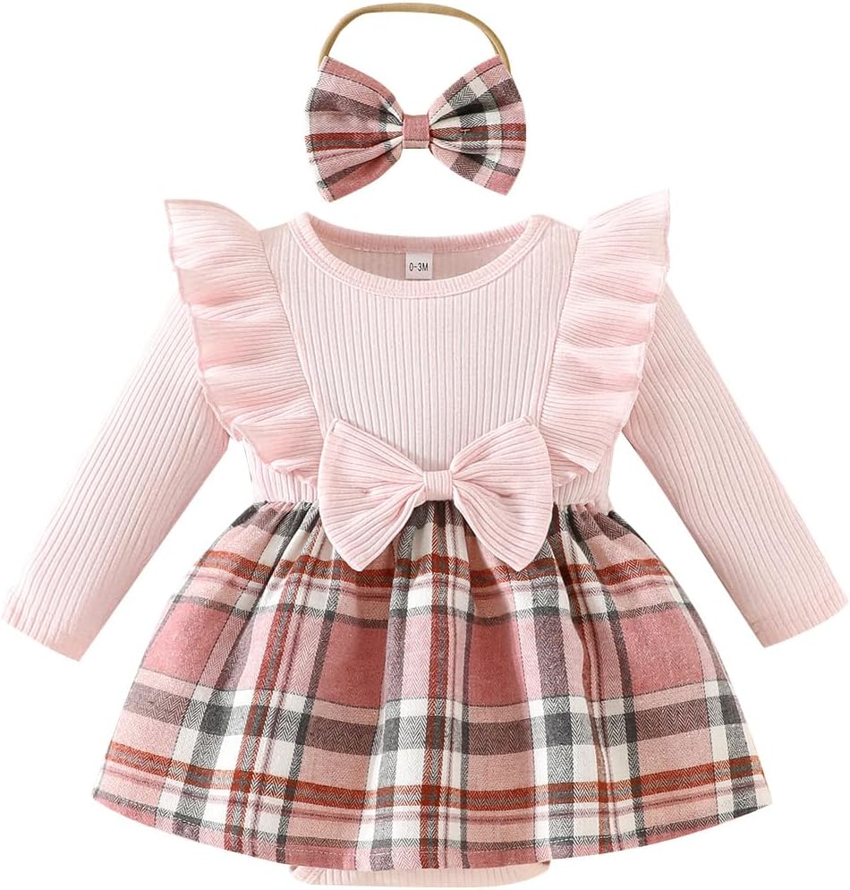Magic Park 0-24M Baby Toddler Girls Ruffle Long Sleeve Bodysuit Ribbed Plaid Romper Dress Fall Winter Outfit with Headband