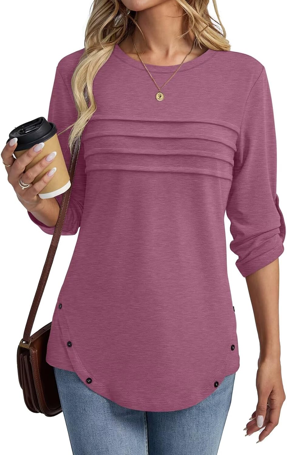 Women's 3/4 Length Rolled Sleeve Tunic Tops Pleated Crew Neck T Shirts Both Side Buttons Summer Blouses