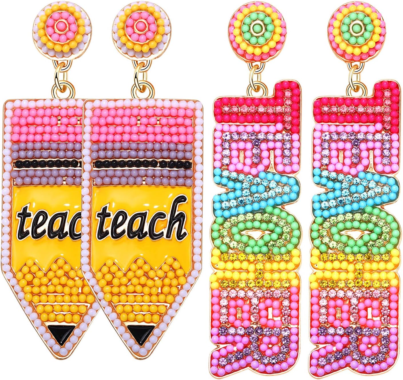 2/3 Pairs Pencil Earrings - Rhinestone Beaded Dangle Drop Earrings for Women - Colorful Teacher Appreciation Gift Set