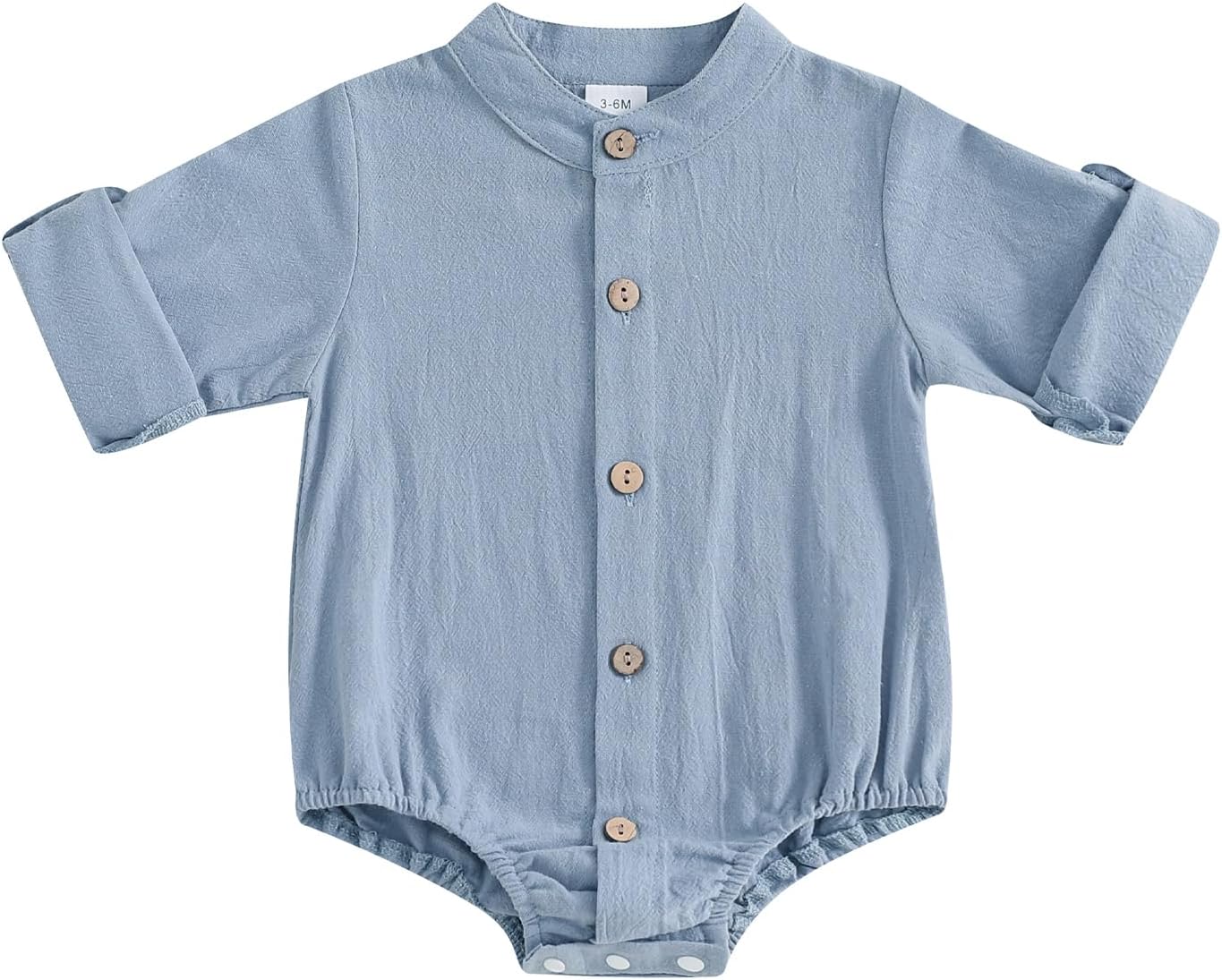 Karuedoo Newborn Baby Boy Clothes Cotton Linen Shirt Bodysuit Button Up Roll Up Long Sleeve Romper Jumpsuit One-Piece Outfit