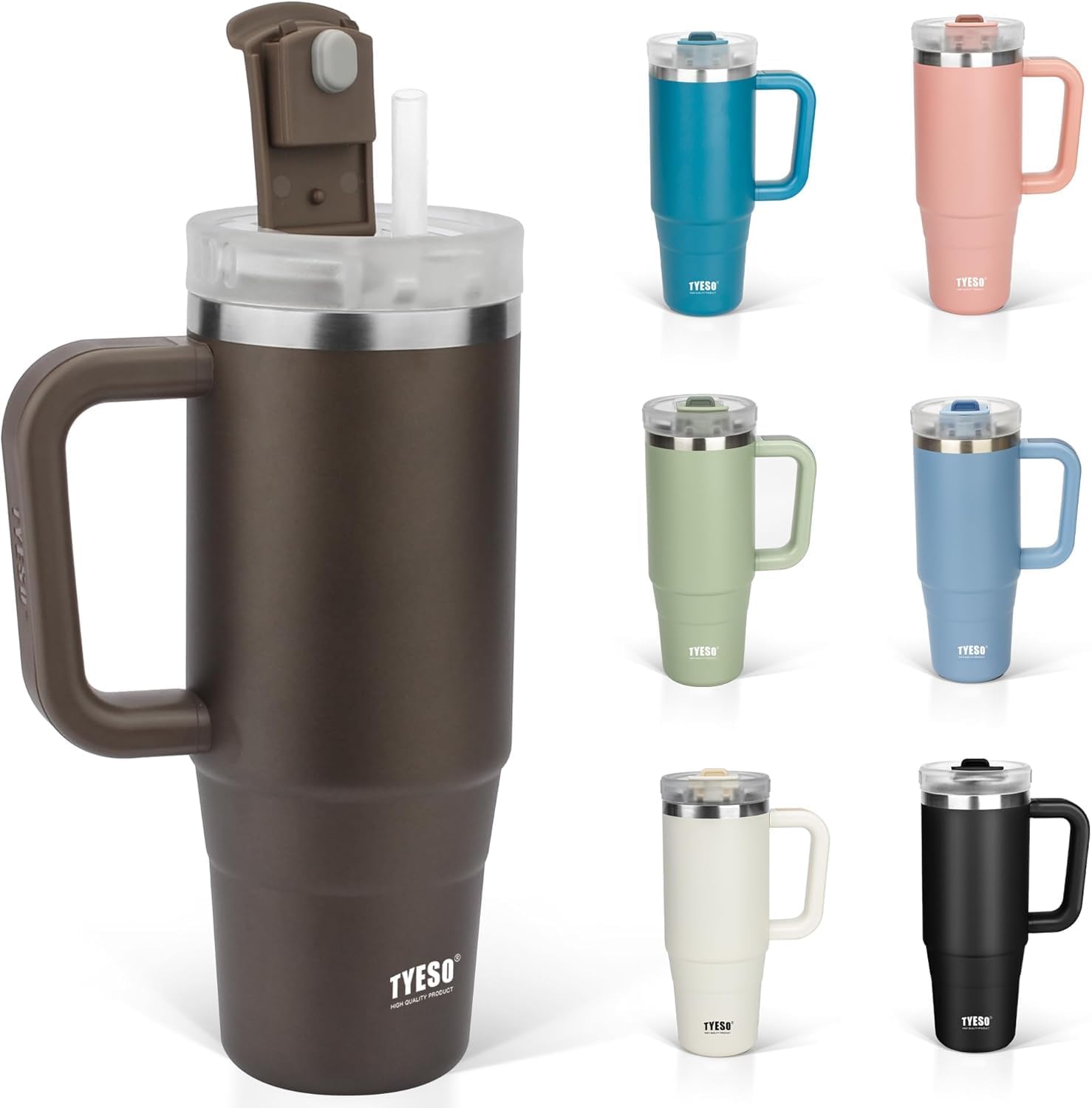 TYESO Vacuum Insulated Tumbler Water Bottle Cold Insulation Stainless Steel Bottle Straw Handle Mug Double Wall Wide Mouth (BROWN, 30 oz)