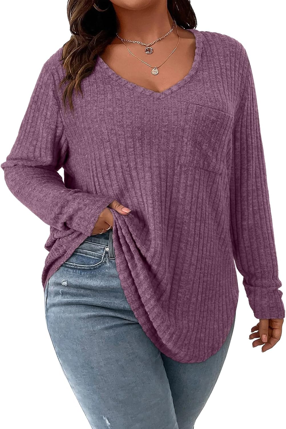 Koscacy Women Plus Size Casual Knit Sweater with Pocket V Neck Solid Color Tops Lightweight Long Sleeve Blouses