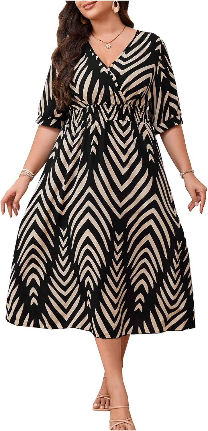 Floerns Women's Plus Size Summer Midi Dress Chevron V Neck Half Sleeve A Line Dresses
