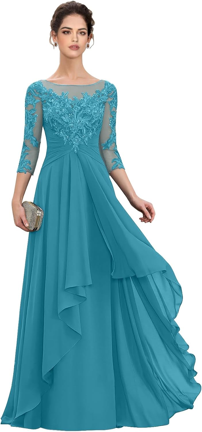 Women's Lace Applique Mother of The Bride Dress for Wedding 3/4 Sleeve Chiffon Formal Evening Dresses