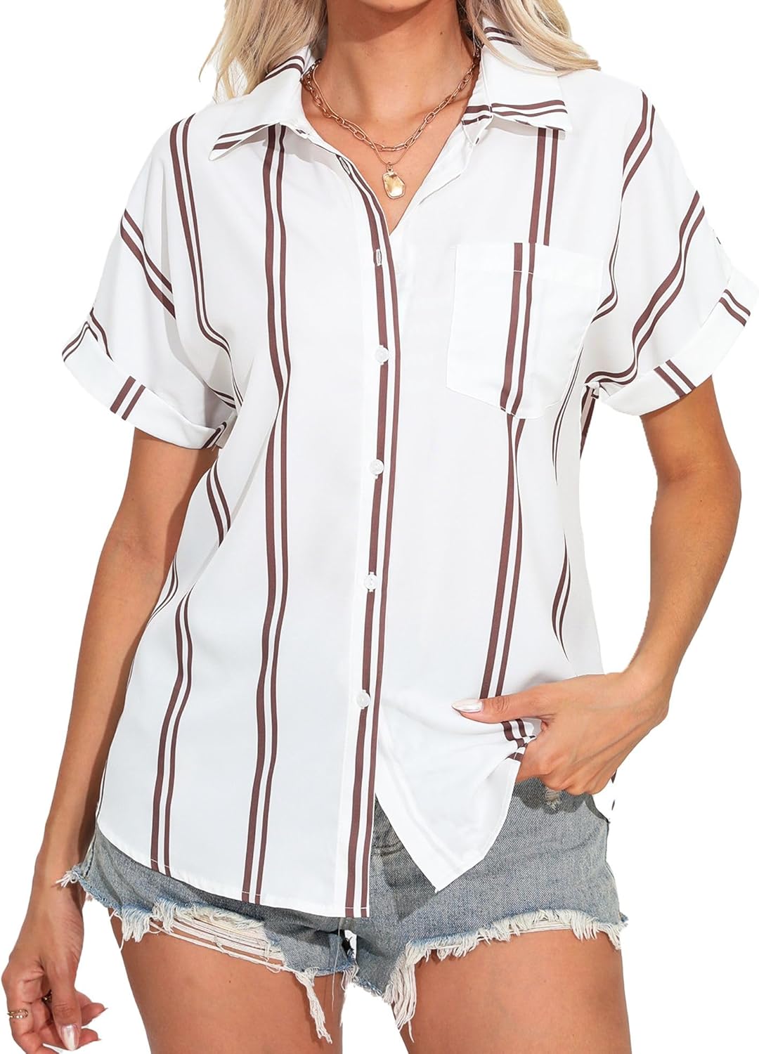 Women's Button Down Shirts Solid Blouse Batwing Short Sleeve Tops with Pockets Dressy Casual