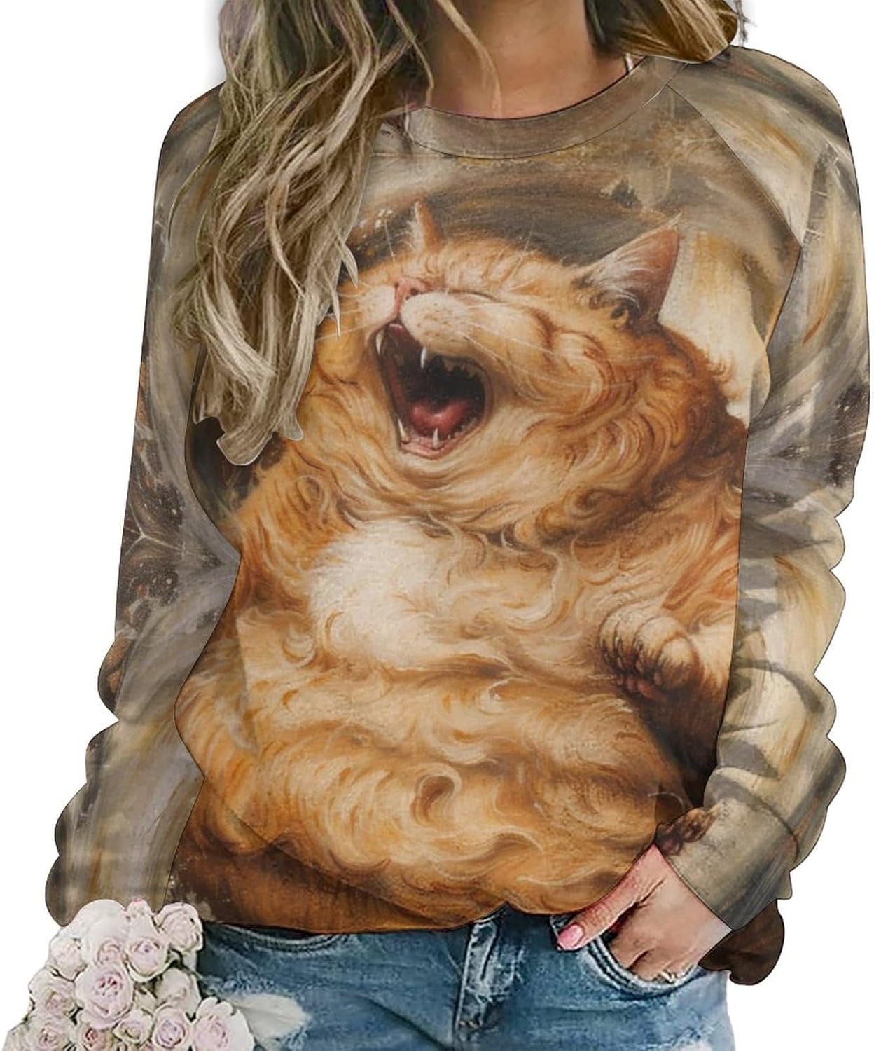 Womens Sweatshirt Oilpainting Cat Print Fall Oversized Cotton Holiday Casual Fashion Warm Crewneck Sweaters