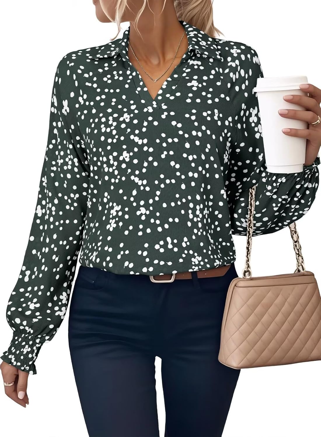 Astylish Womens Fashion Smocked Raglan Sleeves V Neck Collared Tops Chiffon Alicia Flower Print Blouses Spring Dressy Shirts Work Business Boho Tunic Green X-Large