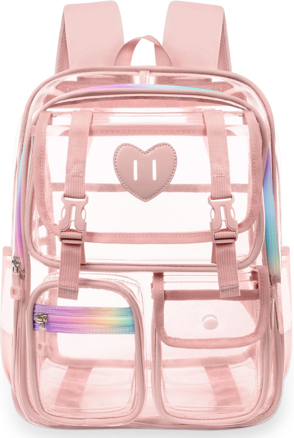 Clear Backpack for Girls Women Heavy Duty Transparent Bookbag School Backpack with Mesh Pockets Stadium Approved See Through Backpack (Pink)