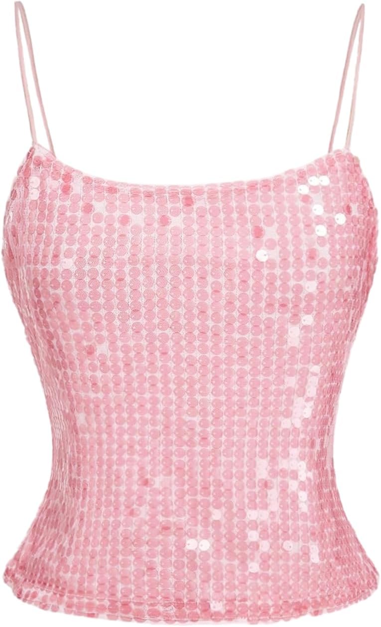 WDIRARA Women's Sparkly Sequin Cami Top Spaghetti Strap Party Club Camisole Crop Tops