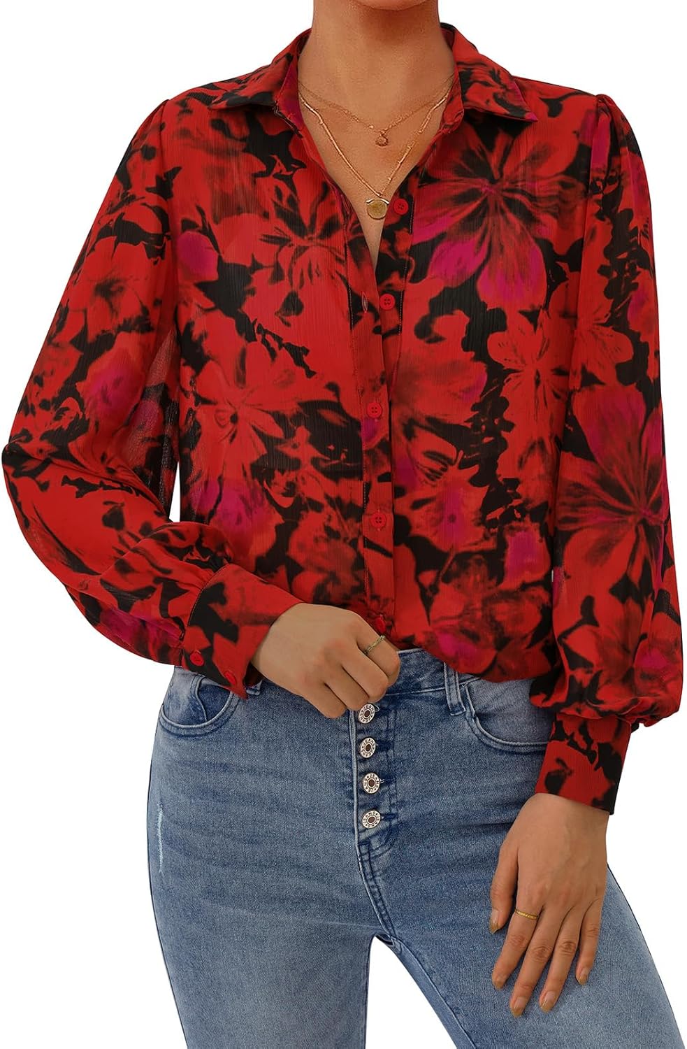 PRETTYGARDEN Women's Floral Blouses Dressy Casual V Neck Button Down Shirts Lantern Long Sleeve Boho Chiffon Spring Tops 2026