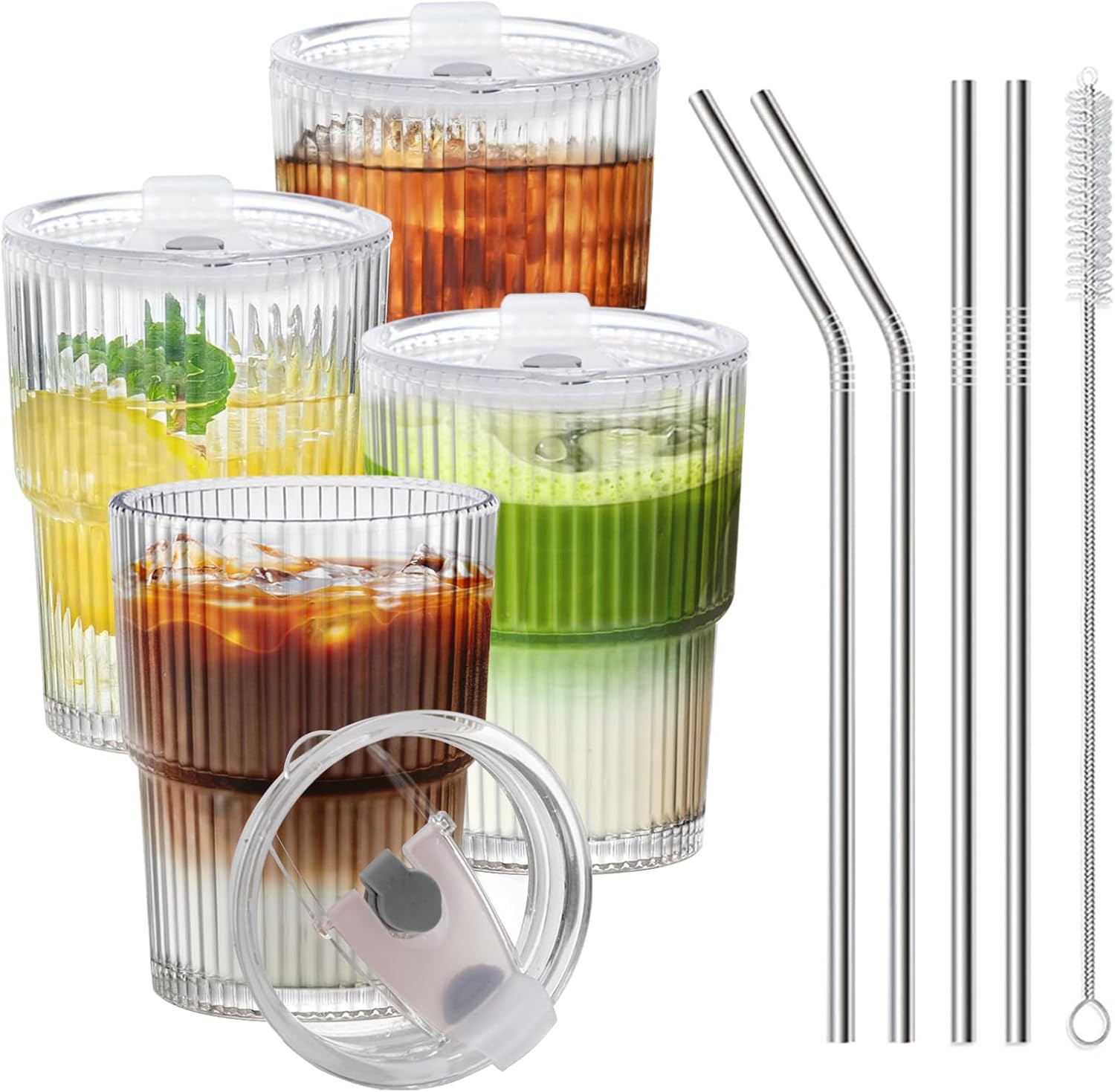 - ICED COFFEE CUP SET PACKAGE-The glass cups set include 4 pcs ribbed glass coffee cups, 4 pcs clear plastic lids, 2 pcs straight stainless steel straw, 2 pcs curve stainless steel straw, 1 straw cleaning busher,very practical drinking glasses set