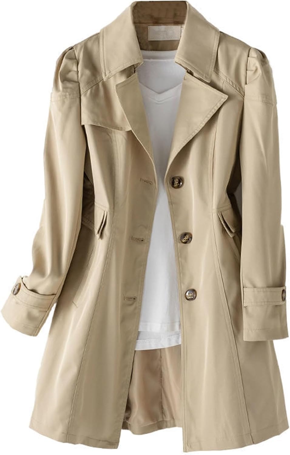 SOMTHRON Women's Single Breasted Mid-Length Trench Coat Puff Sleeve Lapel Overcoat Windproof Classic Outerwear