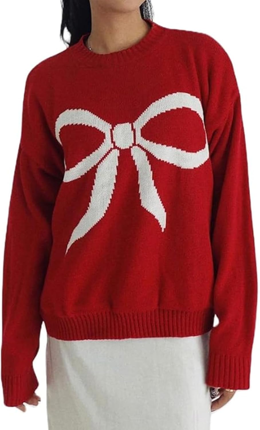 Women Y2K Fall Sweater Cute Bow Print Long Sleeve Cable Knit Pullover Casual Oversized Jumpers for Women