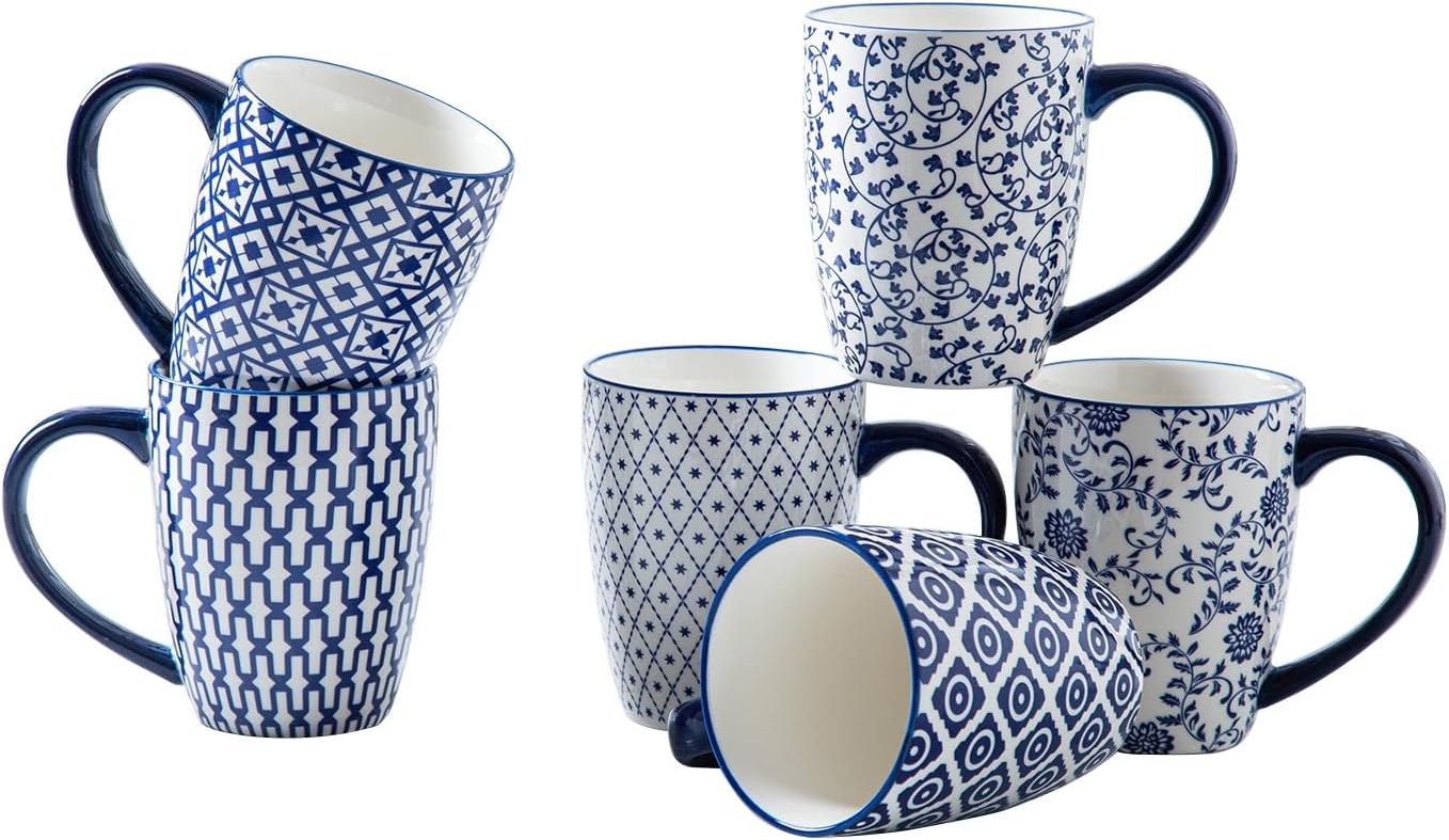 Ceramic Coffee Mugs Set - 16 Oz Large Porcelain Tea Cups with Handle for Women Men Cocoa Cappuccino Latte - Christmas Housewarming Gift - Dishwasher Safe - Set of 6 - Vintage Blue