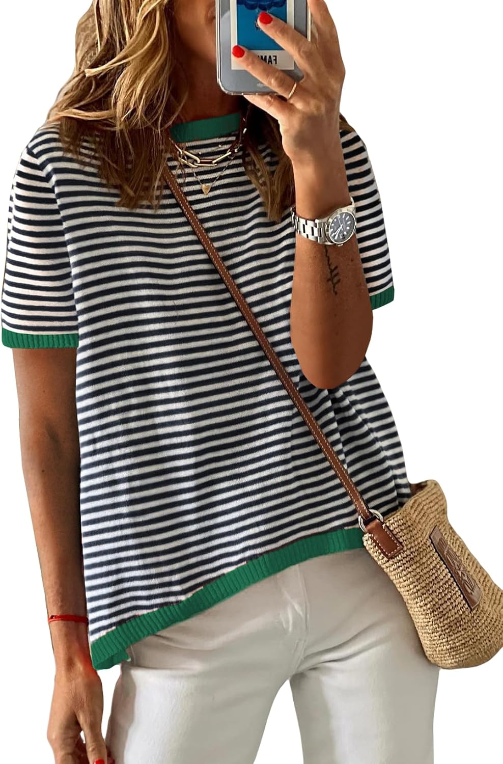 Womens Sweaters Casual Crewneck Short Sleeve Striped Color Block Knitted Cotton Trendy Pullover Sweater Tops
