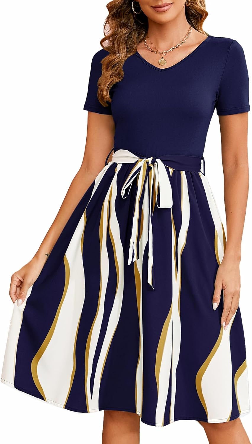 Women's Summer Casual Elegant Vintage Stripe V Neck Short Sleeve Work Party A-Line Knee-Length Dress with Belt D824
