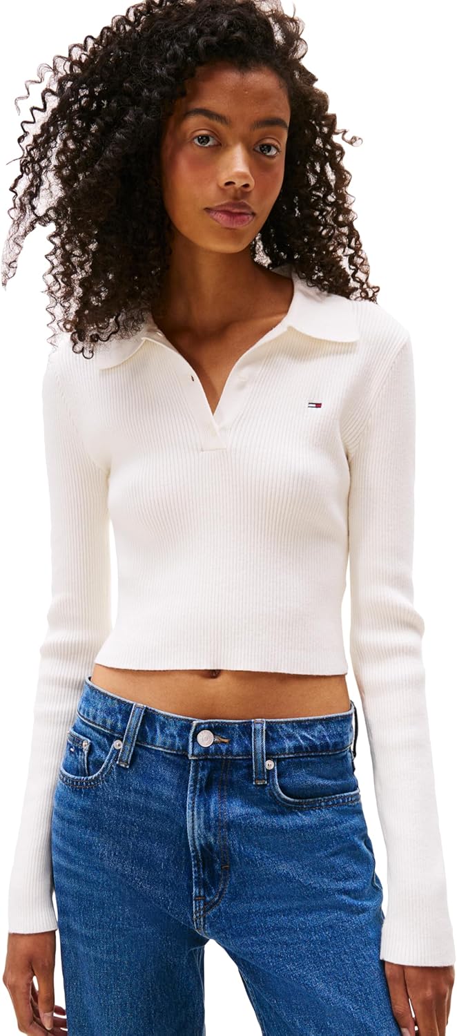 Tommy Jeans Women's Medium Weight Long Sleeve Sweater Polo with Embroidered Flag Logo