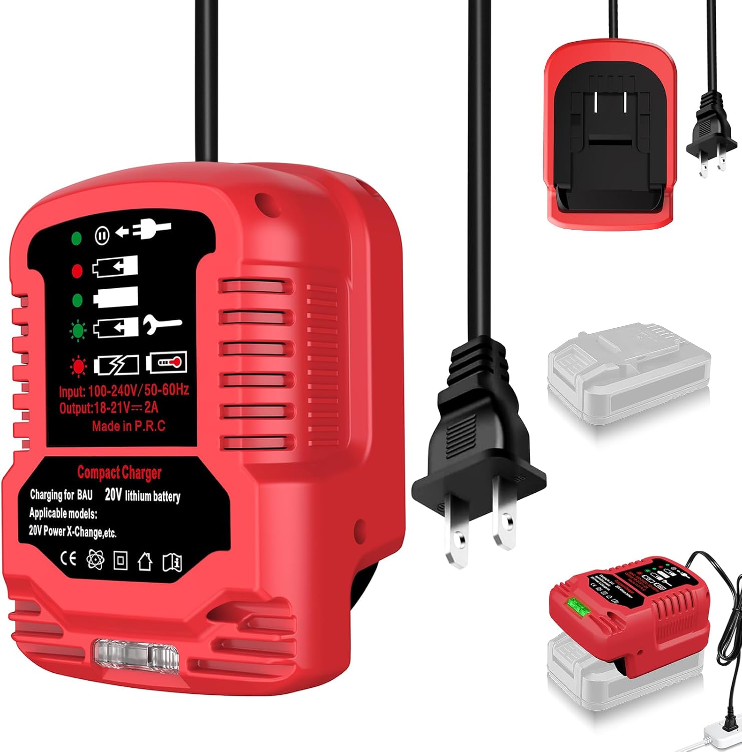 - This portable 20V replacement charger features a clear LED indicator that displays real-time charging status at a glance. Built with advanced safety technology, it provides triple protection against overheating, overcharging, and short circuits to extend your battery's lifespan.