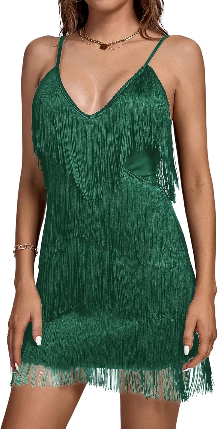 Umenlele Women's Layered Fringe Deep V Neck Cami Mini Dress Sleeveless Tassels Flapper Party Dresses Dark Green X-Small