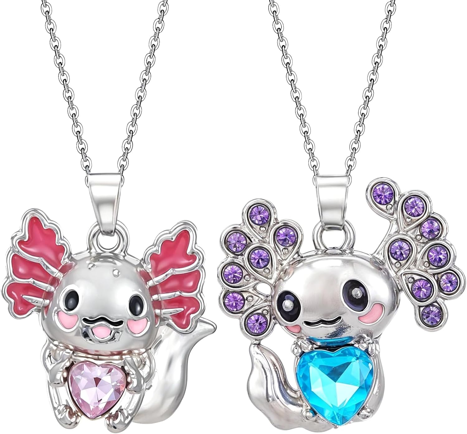 2PCS Cute Axolotl Necklaces for Girl Boy,Blue and Pink Crystal Heart Pendant Necklace,Alloy Axolotl Necklace Good Lluck Jewelry Gift for Birthday Christmas Graduation Gift