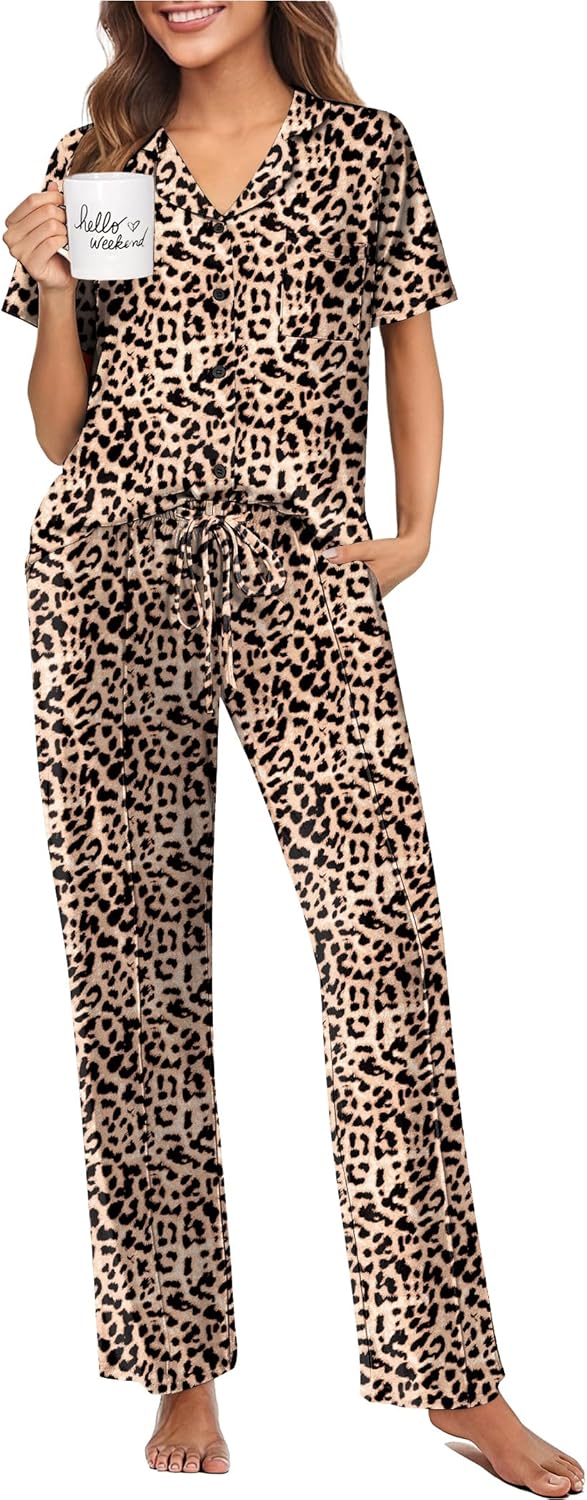 Ekouaer Pajamas for Women Set Button Up Sleepswear 2 Piece Short Sleeve PJ Top and Long Pants Loungwear With Pocket S-XXL