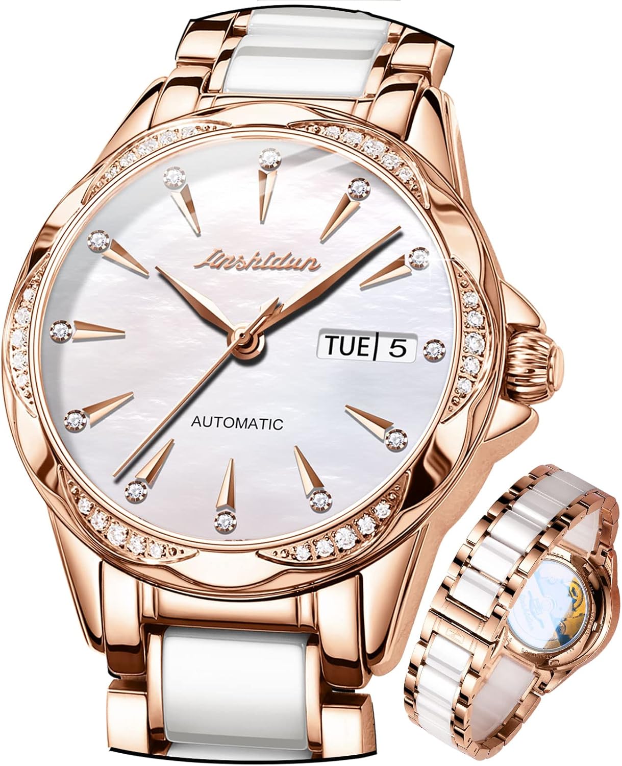 OLEVS Ladies' Automatic Mechanical Watches, Mechanical Self-Winding Waterproof, Rose Gold Ceramic Stainless Steel Women's Fashion Watches, No Battery (Red/White Dial)