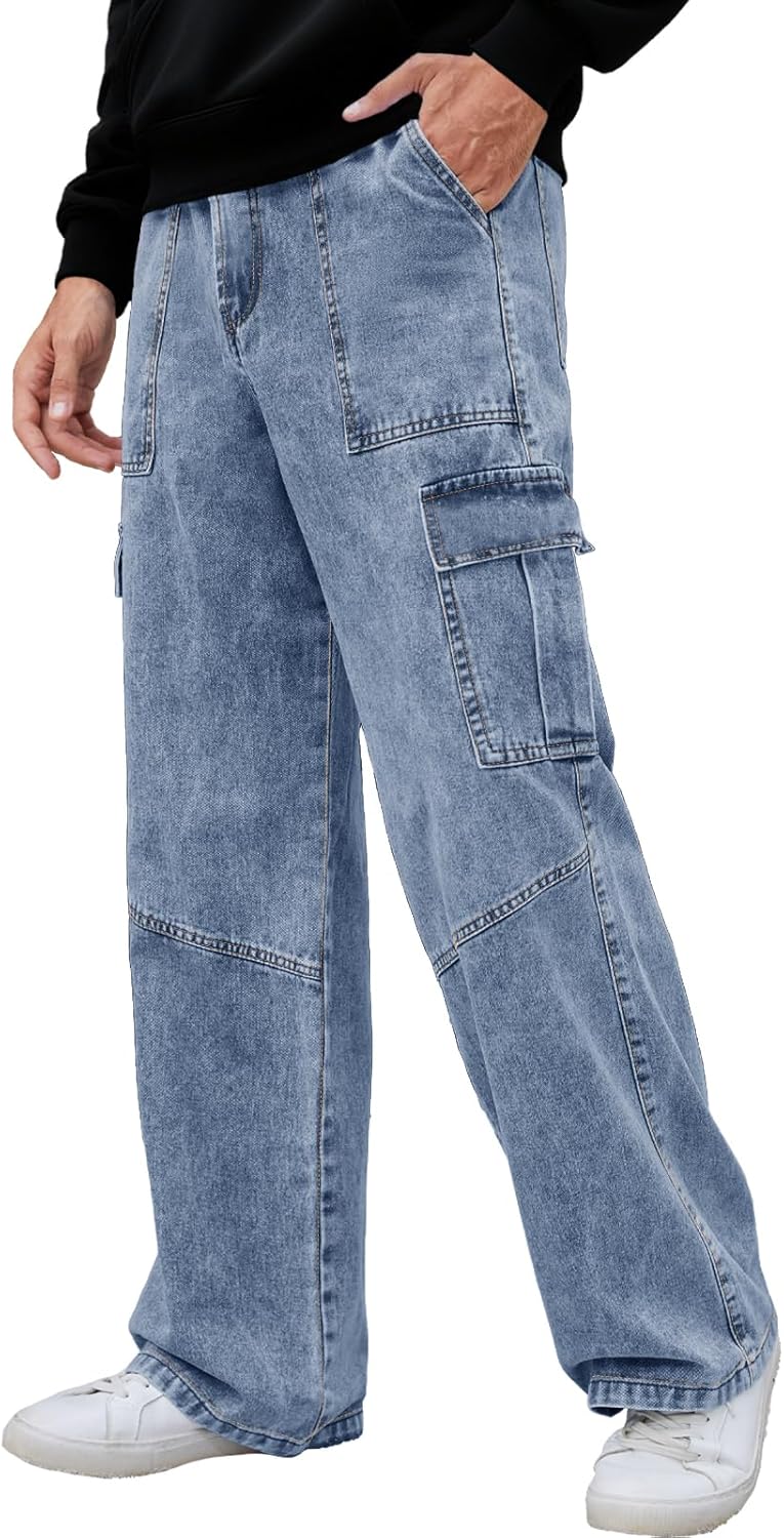 Mens Baggy Cargo Jeans Wide Leg Elastic Waist Jean Loose Fit Casual Denim Utility Pants Streetwear