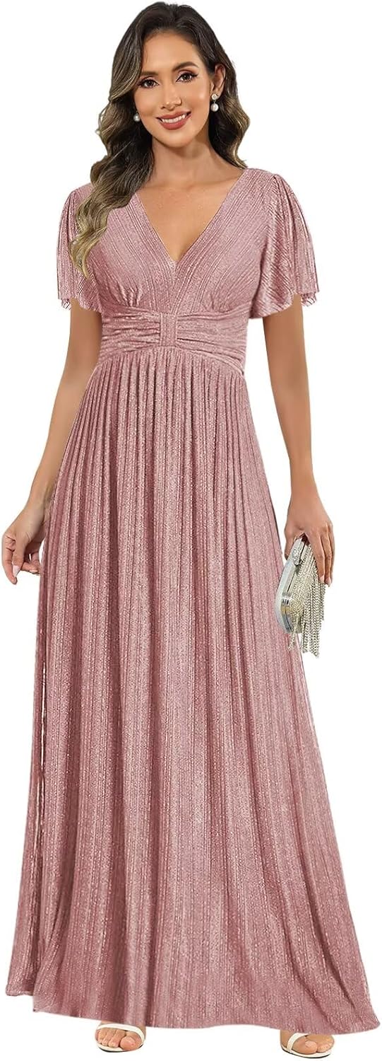Sparkly Mother of The Bride Dress Long A-Line V-Neck Pleated Formal Bridesmaid Dress