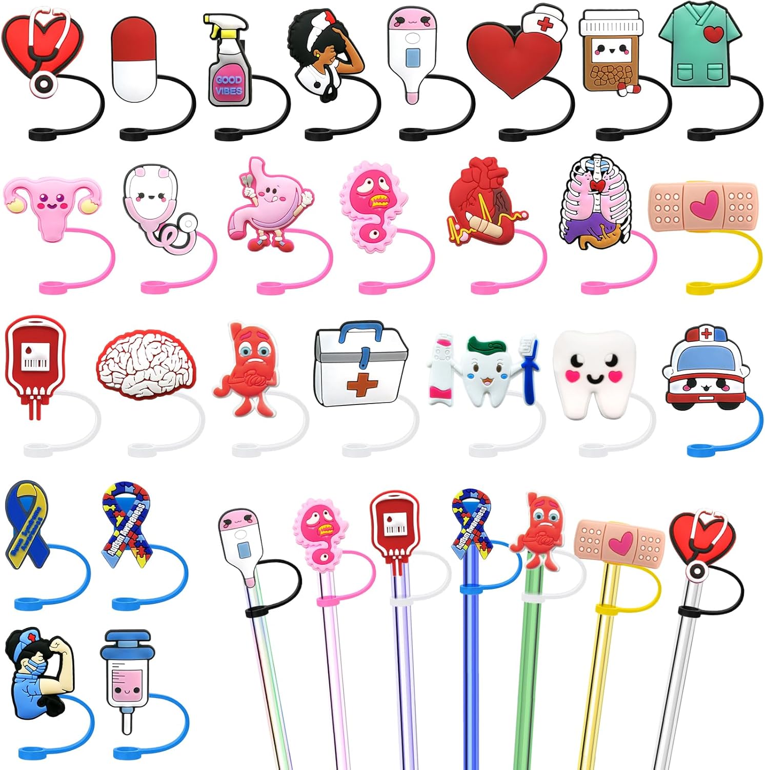 - APPLICATION: Silicone straw toppers healthcare can keep the straw clean and has the function of dustproof and sealing. At the same time the cute straw covers are decorative and can be given as a gift to friends, family or medical workers. Straw tip covers contain 26 kinds of nurse-themed patterns, are the first choice for Doctor's Day, Nurses' Day gifts, in addition to birthday parties or outdoor activities