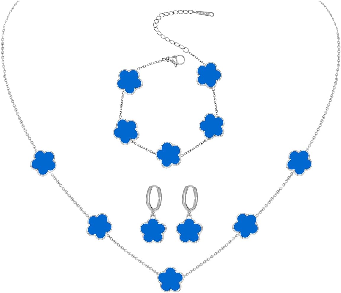 Gold Plated Stainless Steel Four Leaf Clover Bracelet Necklace and Earrings Jewelry Set for Women