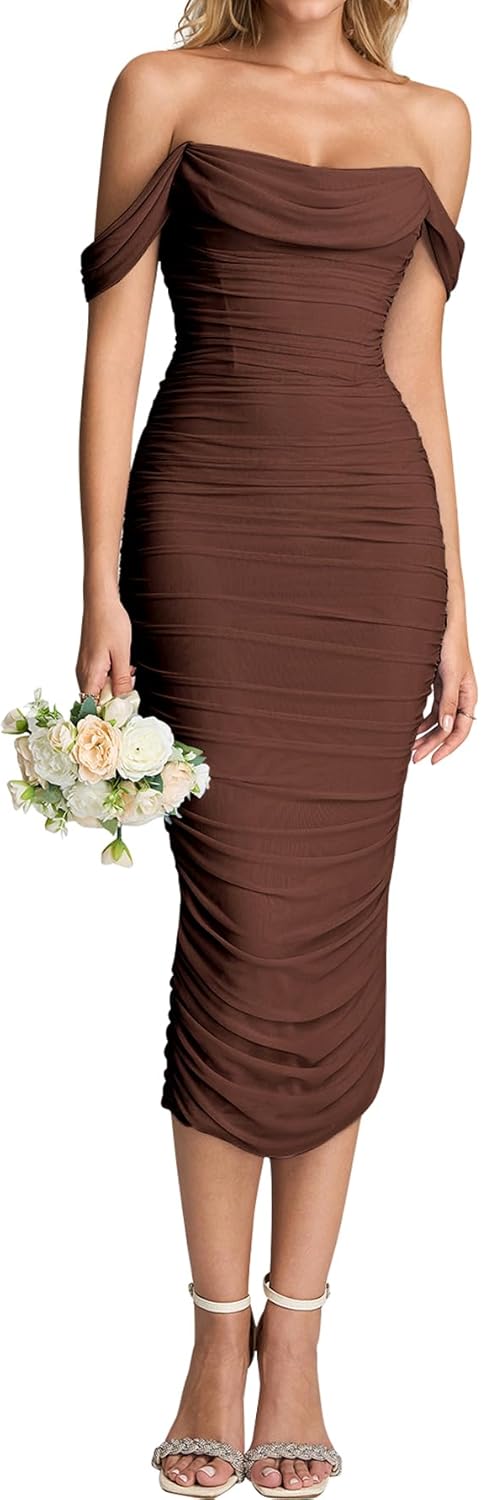 KUTUMAI Off Shoulder Corset Formal Wedding Guest Dresses for Women Elegant Bodycon Ruched Cocktail Party Midi Dress
