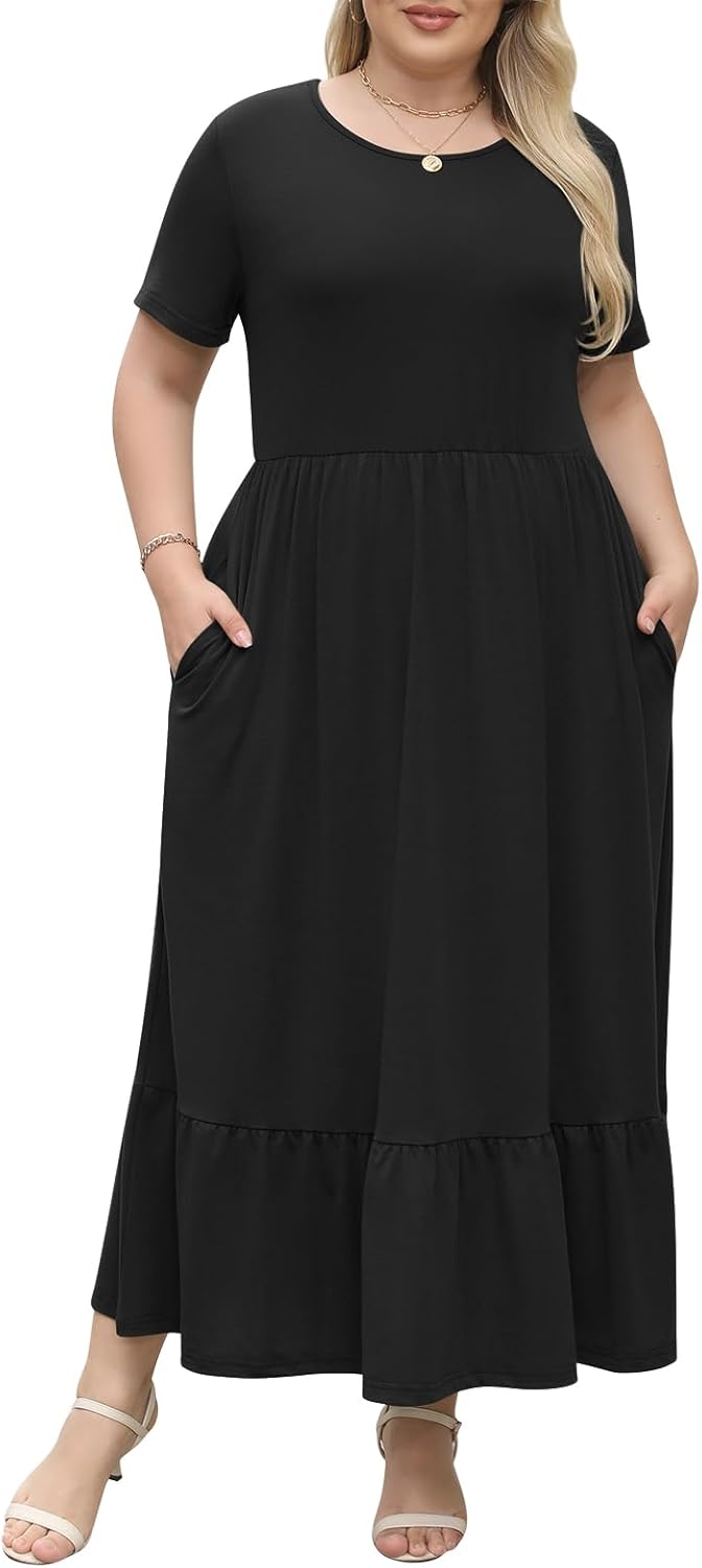 Plus Size Summer Maxi Dress for Curvy Women A-Line Swing T-Shirt Dress with Pockets Casual Everyday Wear ELG002