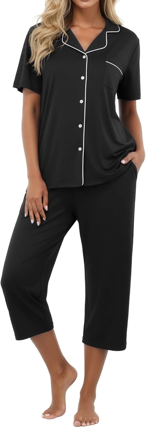PrinStory Capri Pajamas for Womens Button Down Pjs Short Sleeve Comfy Lounge Set 2 Piece Pj Sets with Pockets