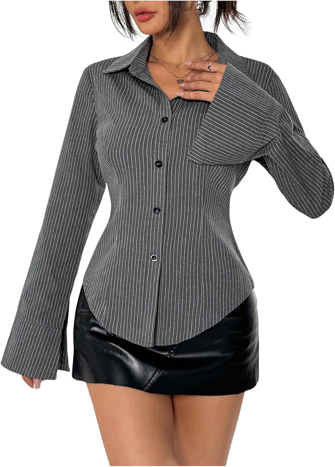 Floerns Women's Striped Print Long Sleeve Shirts Button Down Lapel Neck Work Blouse Tops