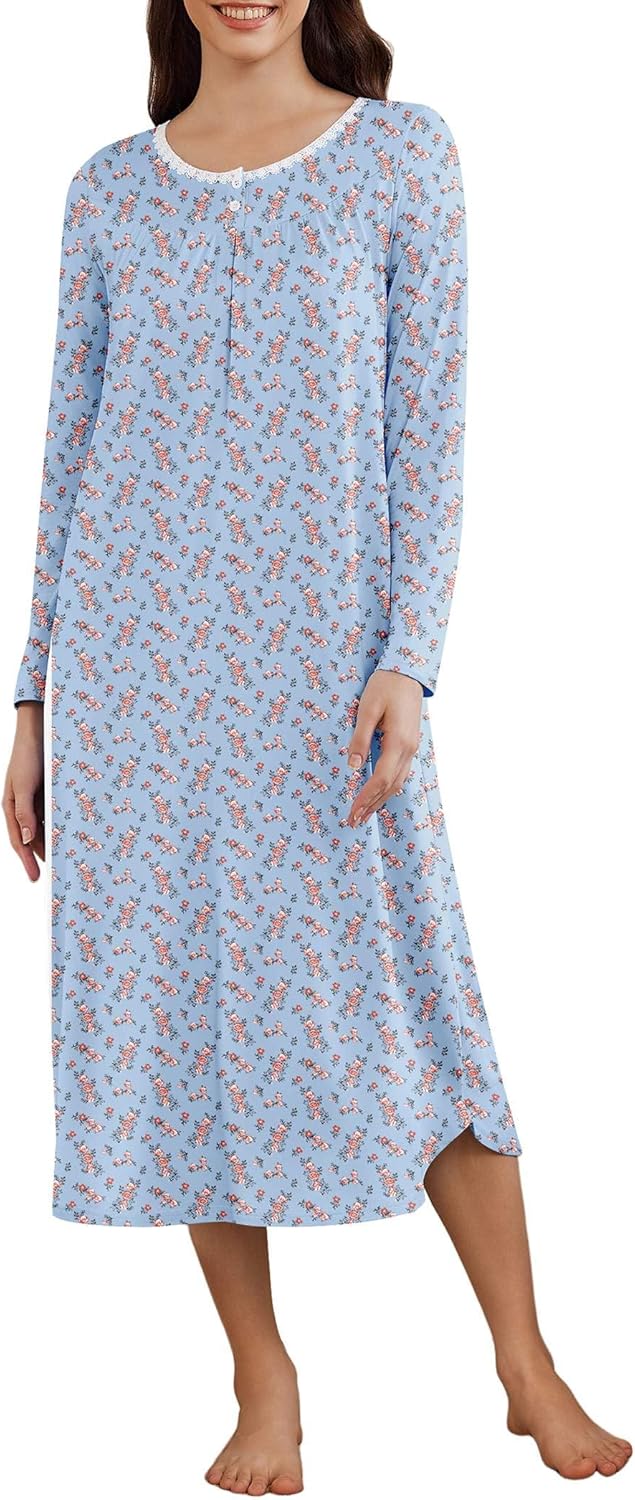 Ekouaer Women's Long Sleeve Nightgown Long Sleepshirt Henley Nightgowns Full Length Sleep Dress with Pockets S-3XL