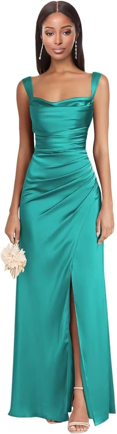 Spaghetti Straps Satin Bridesmaid Dresses with Slit for Women Cowl Neck Pleates Mermaid Bodycon Formal Evening Dress