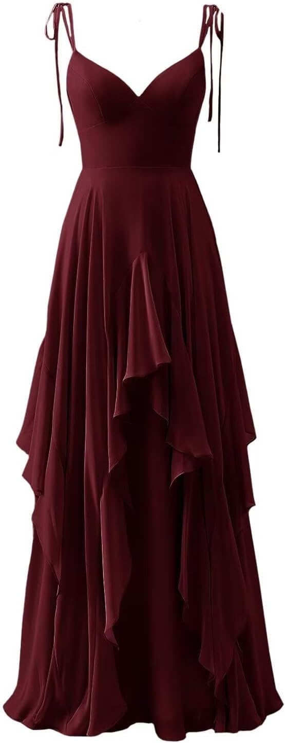 Spaghetti Chiffon V-Neck Formal Evening Cocktail Party Dresses for Women, Wedding Gowns Prom Dresses with Ruffles
