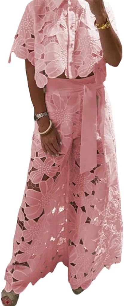 Vacation Outfits Button Down Lace Shirt with Wide Leg Pants Crochet Sets Two Piece Women Cover Up
