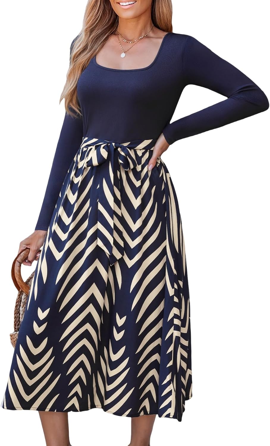 CUPSHE Womens Fall Casual Work Dress Long Sleeve Square Neck Waist Tie Abstract Print Midi Dresses