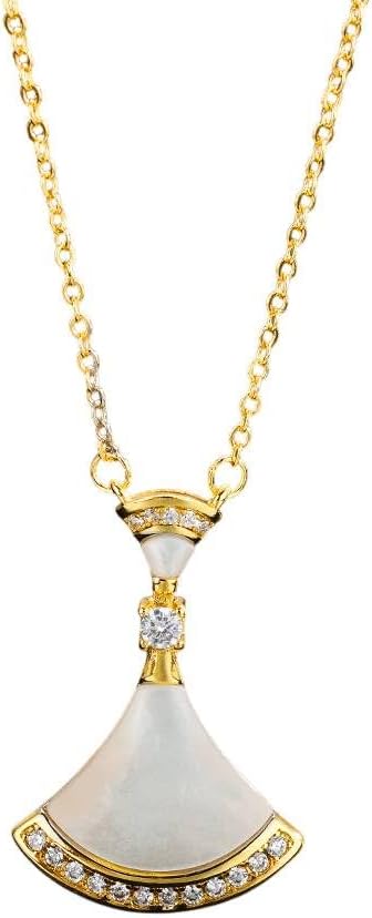 18K Gold Plated Elegant Gold Plated Fan Pendant Necklace for Women – White Shell Inlay with Sparkling Cubic Zirconia, Asian Inspired Design