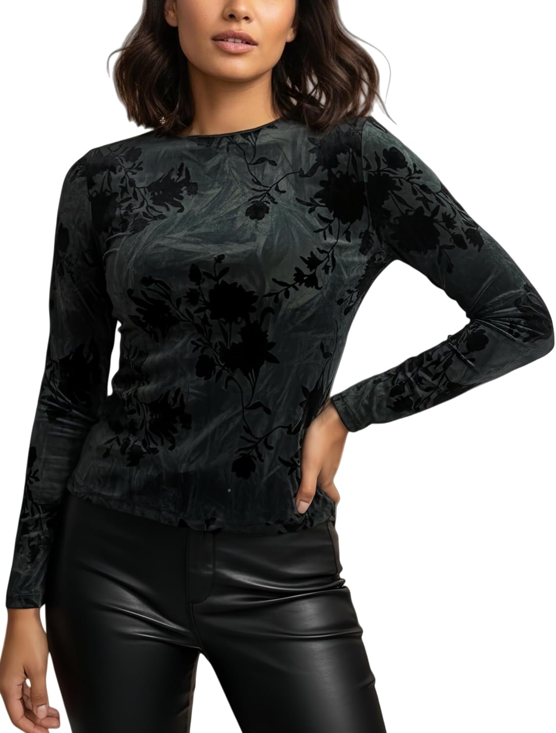 Women's Velvet Burnout Top Slim Fit Long Sleeve Blouse Mock Neck Party Evening Floral Elegant Shirts